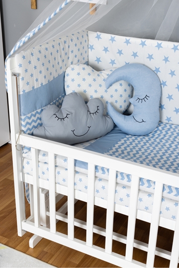 Ahşap Beşik Anne Yanı Beşik Beyaz 60x120 - Mavi Yıldız 3 Yastıklı Uyku Seti + Yataklı