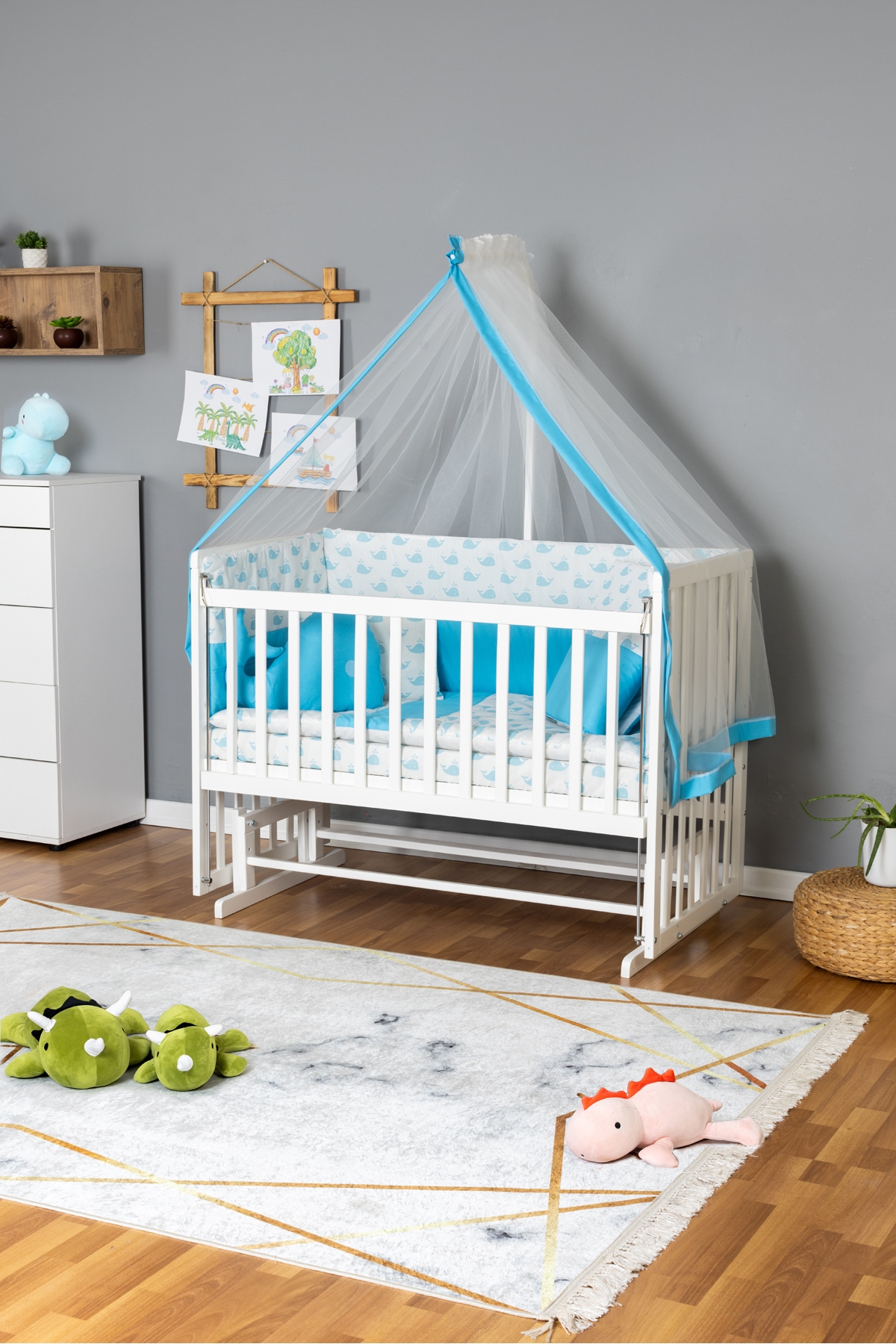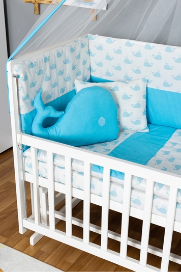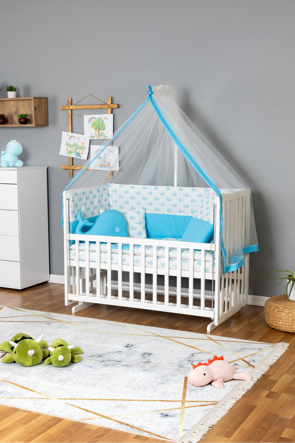 Ahşap Bebek Beşik Anne Yanı Beşik Beyaz 70x130 - Mavi Balina Uyku Seti Yataklı