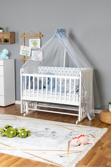 Ahşap Bebek Beşik Anne Yanı Doğal Beşik Beyaz 70x130 - Mavi Yıldız 3 Yastıklı Uyku Seti Yataklı