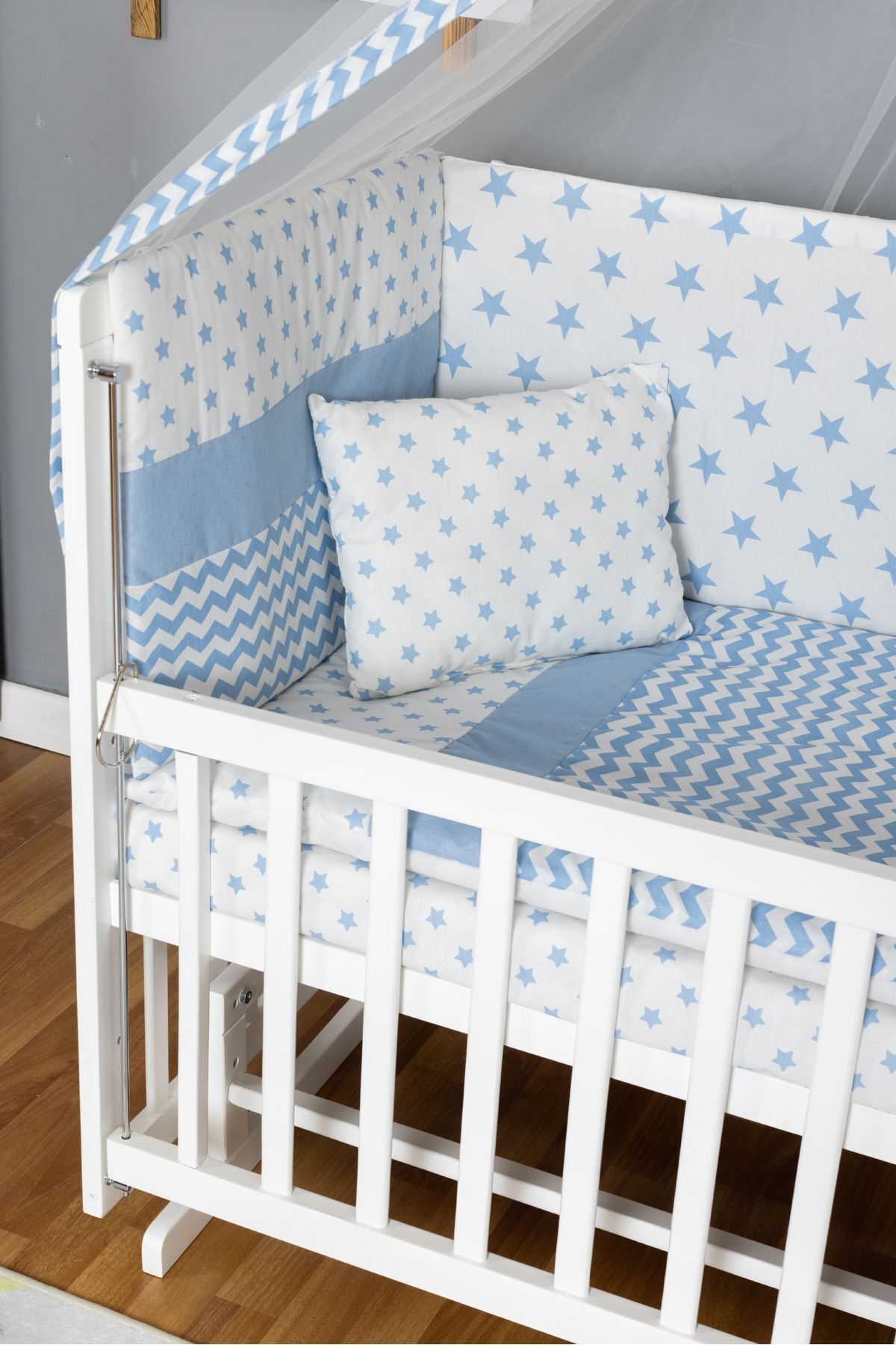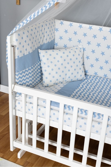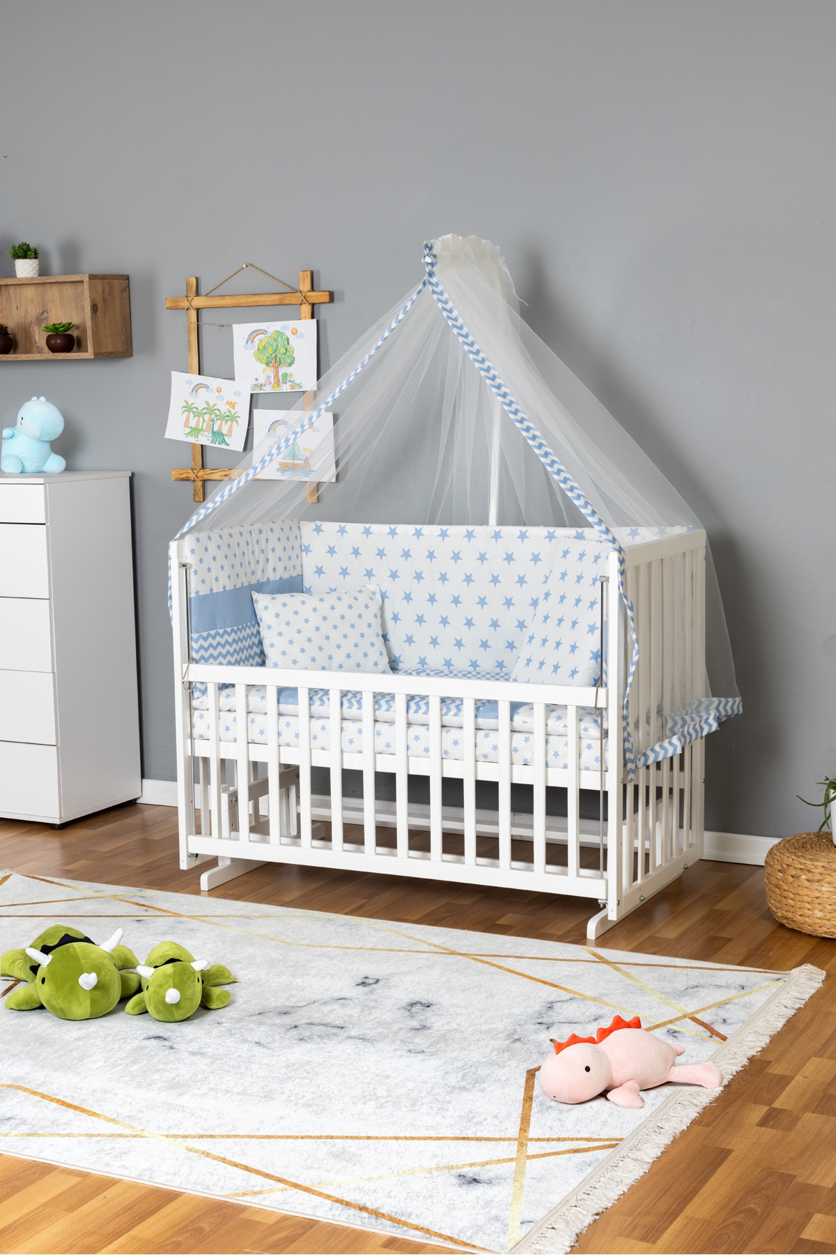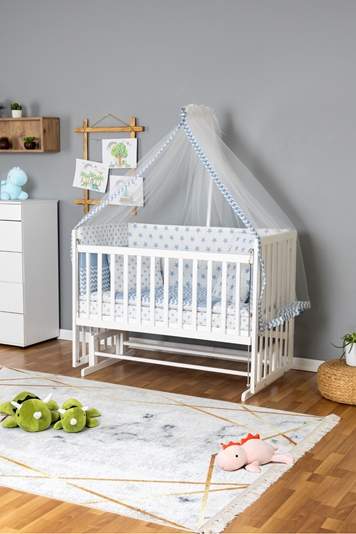 Ahşap Beşik Anne Yanı Bebek Beşik Beyaz 70x130 - Mavi Yıldız 1 Yastıklı Uyku Seti Yataklı