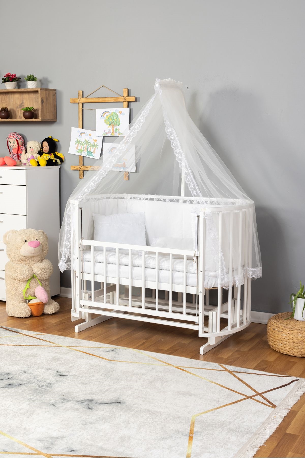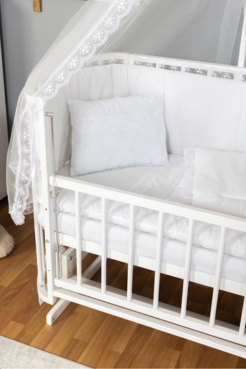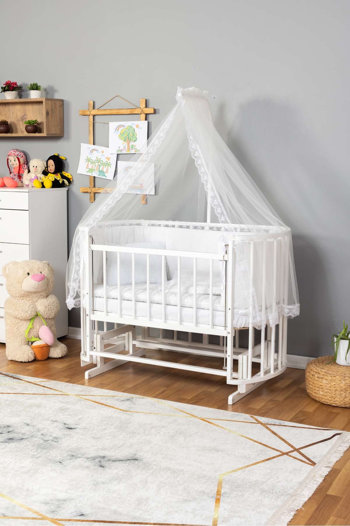 Ahşap Anne Yanı Bebek Beşikleri 60x120 Beyaz Güpür Uyku Seti Yatak