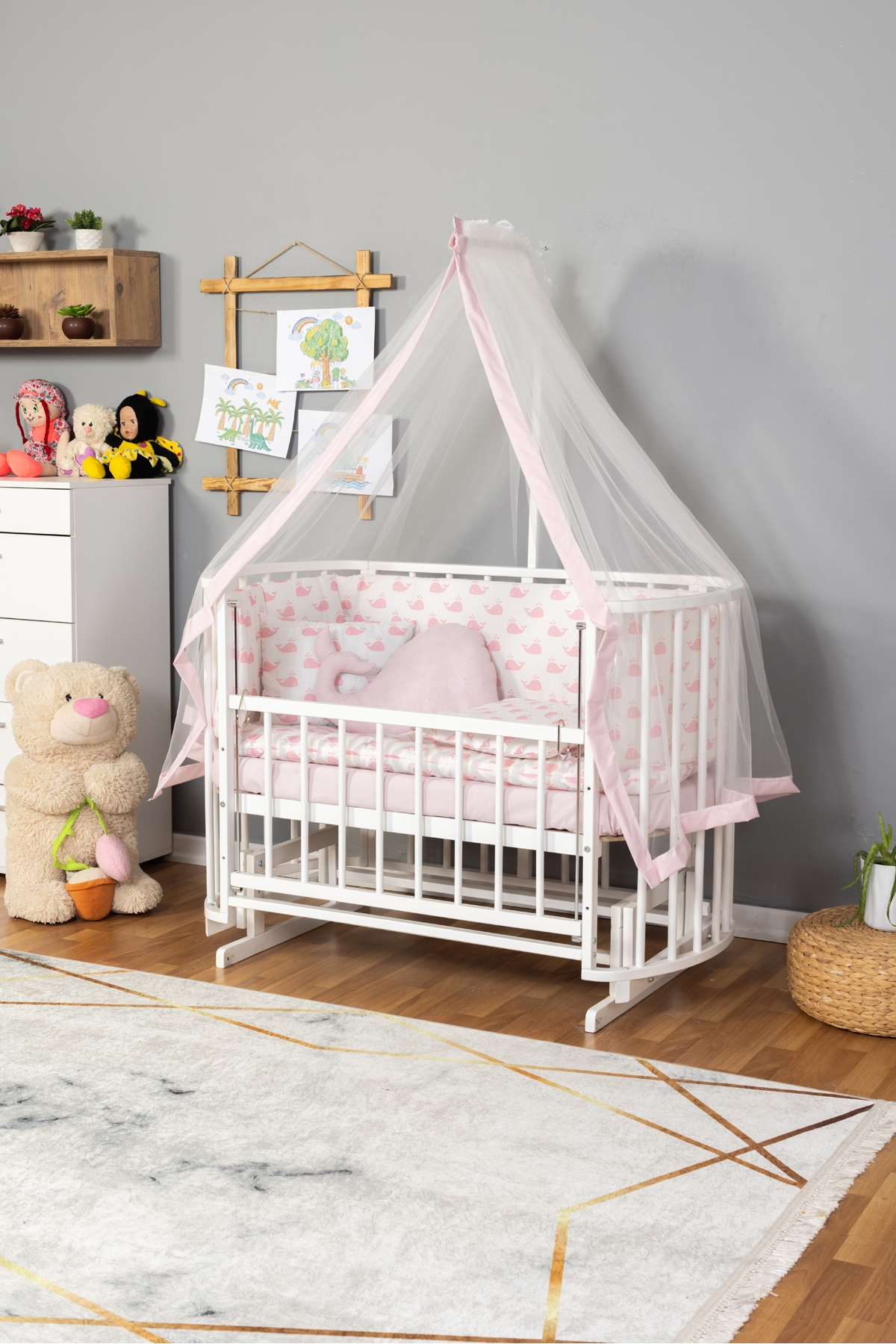 Ahşap Bebek Beşik Anne Yanı Beşik Beyaz 60x120 Pembe Balina Uyku Seti Yatak