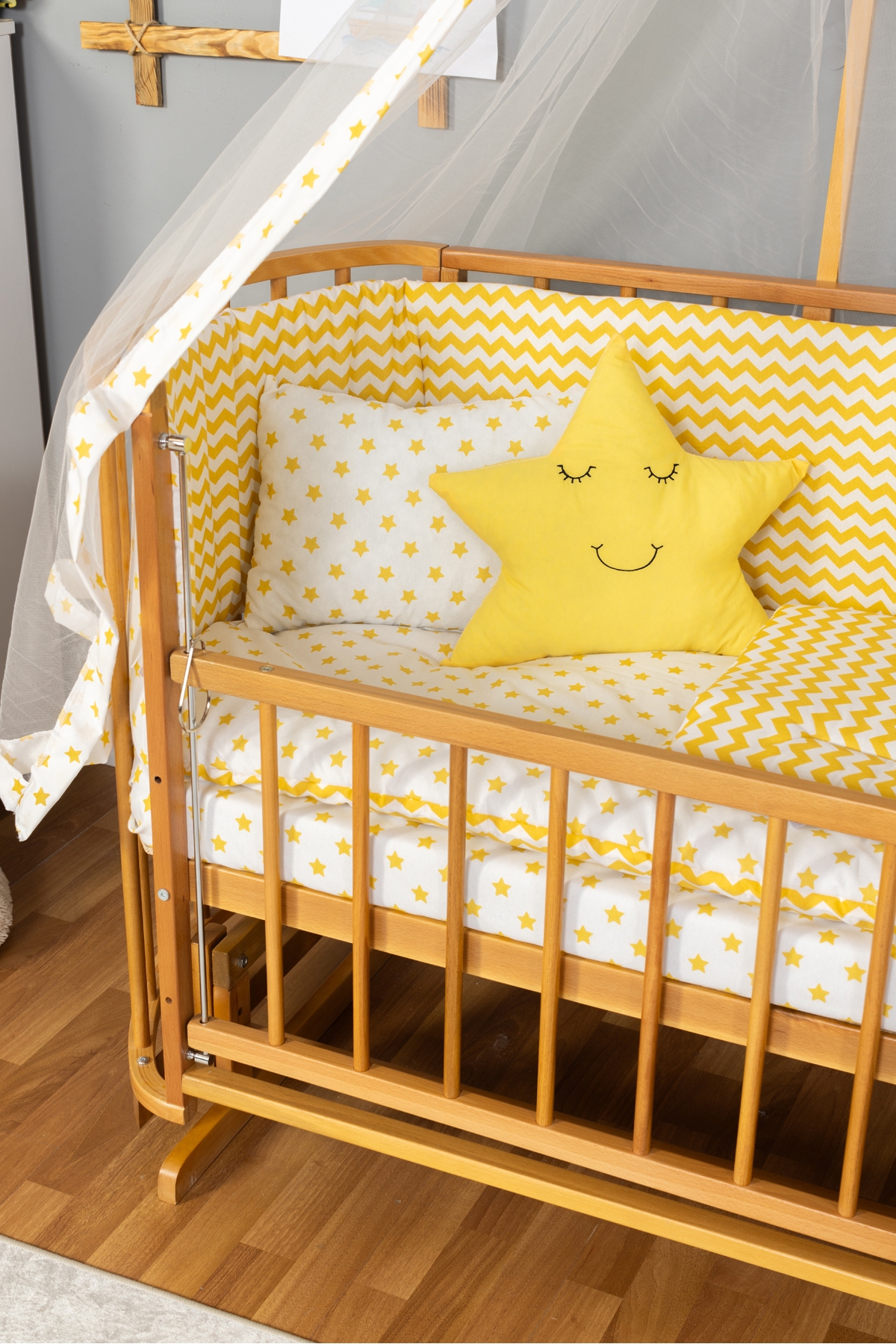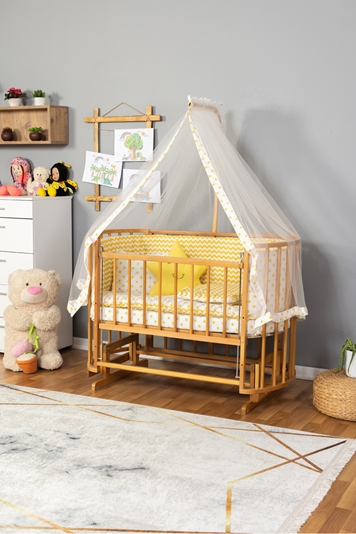 Ahşap Beşik Anne Yanı Beşik Sallanır Beşik Doğal (VERNİKLİ) 60x120 Sarı Yıldız Uyku Seti Yatak