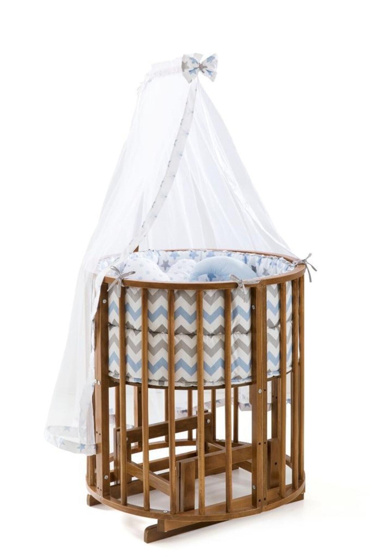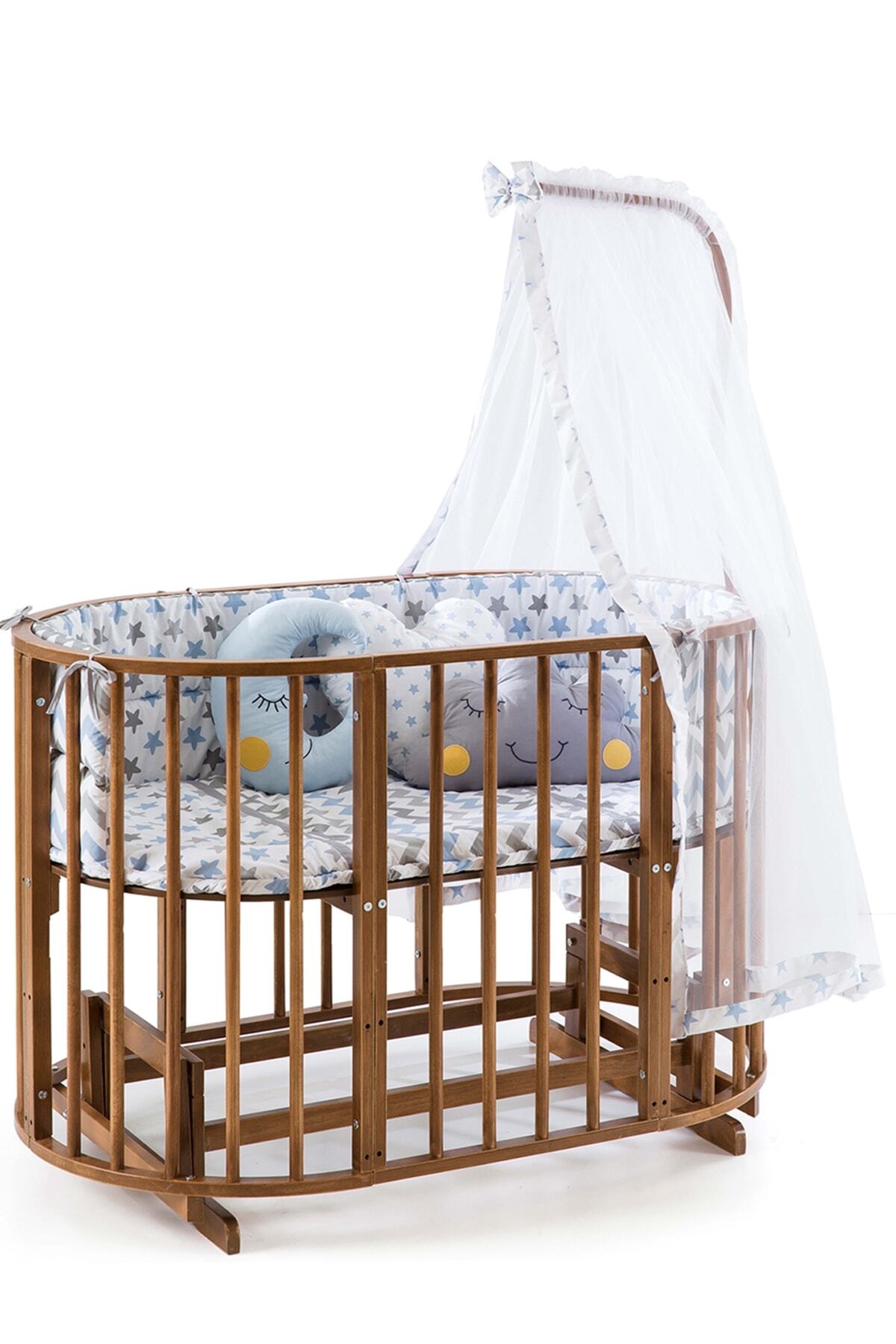 Ahşap Beşik (BEBEĞİNİZ İLE BÜYÜYEN BEŞİK) Ceviz Mavi Yıldız Uyku Seti Yatak Tekerlekli