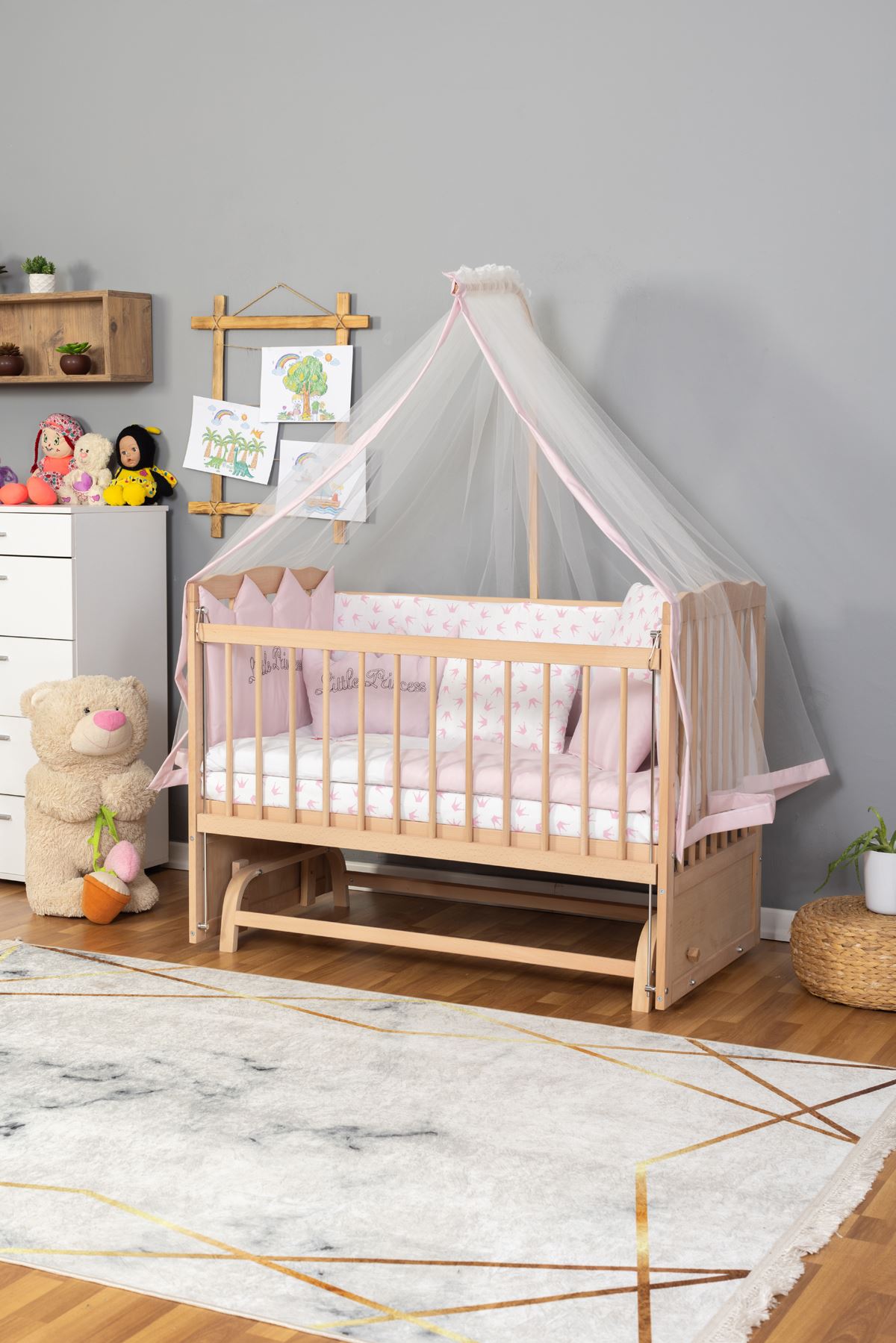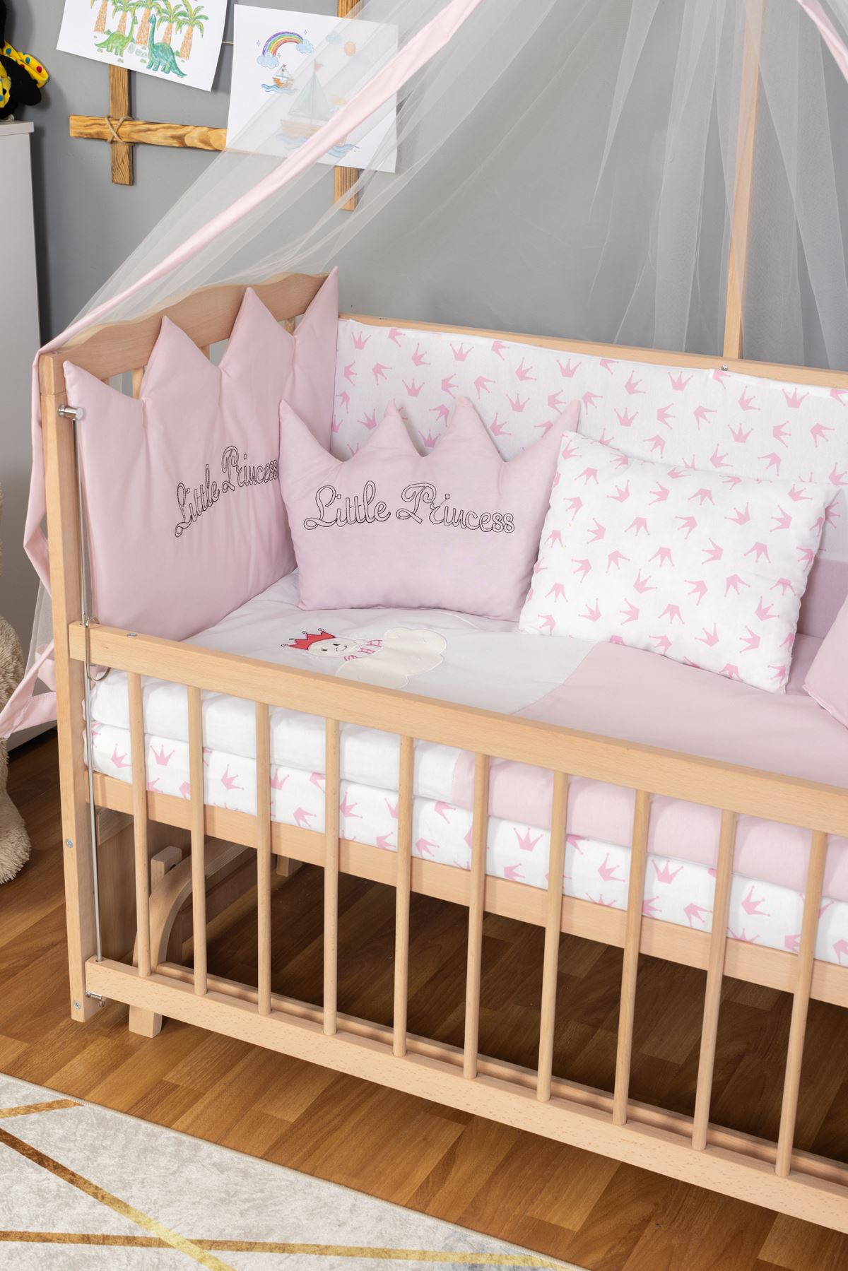 Ahşap Beşik Anne Yanı Bebek Beşik Organik (BOYASIZ) 60x120 - Pembe Prenses (KIZ) Uyku Seti Yatak