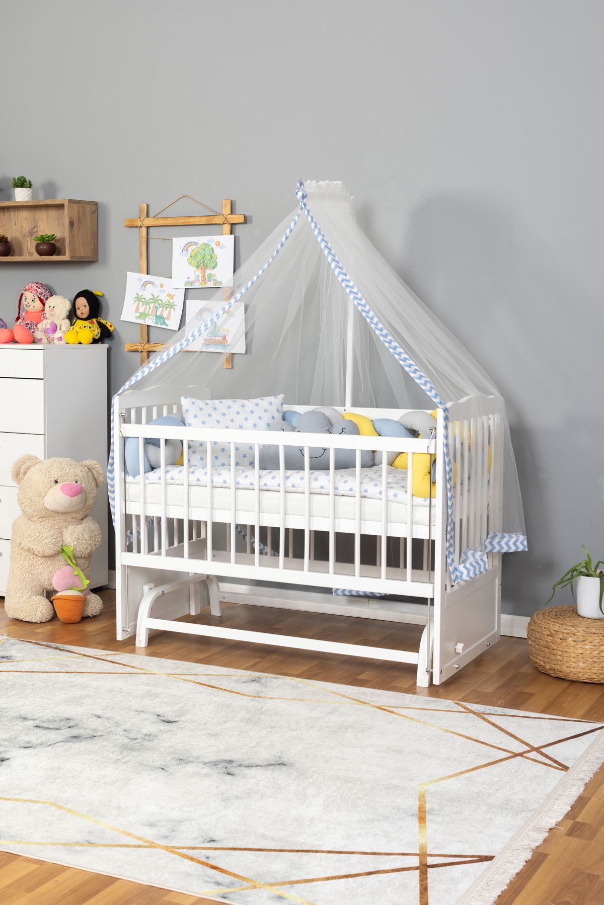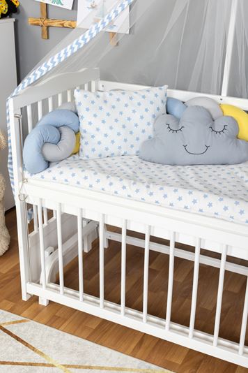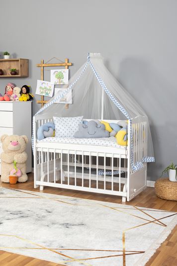 Ahşap Beşik Anne Yanı Beşik Beyaz 60x120 - Sarı Mavi Örgü Uyku Seti Seti + Yatak