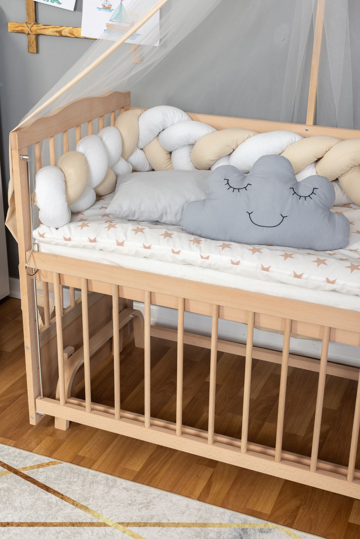 Ahşap Beşik Anne Yanı Beşik Organik 60x120 - Krem Beyaz Örgü Uyku Seti Seti