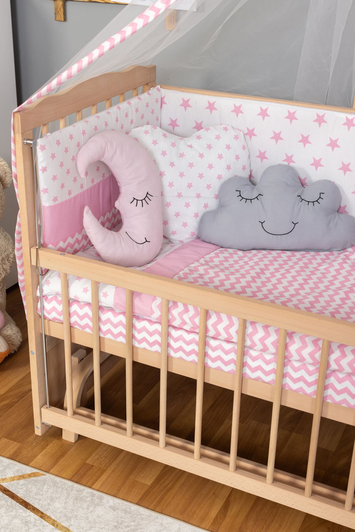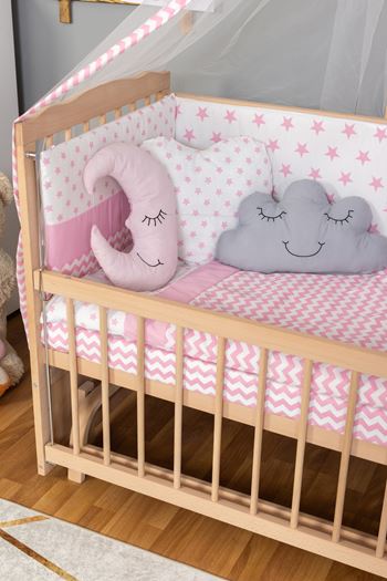 Ahşap Beşik Anne Yanı Beşik Organik(Boyasız) 60x120-Pembe Yıldız 3 Yastık Uyku Seti + Yatak