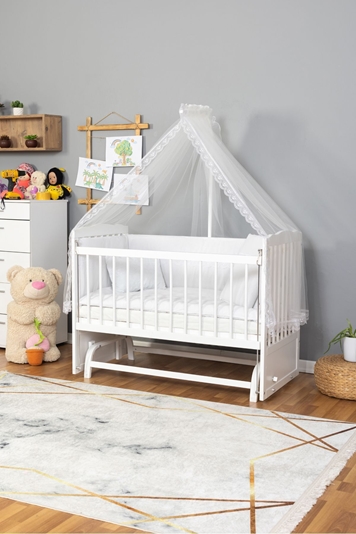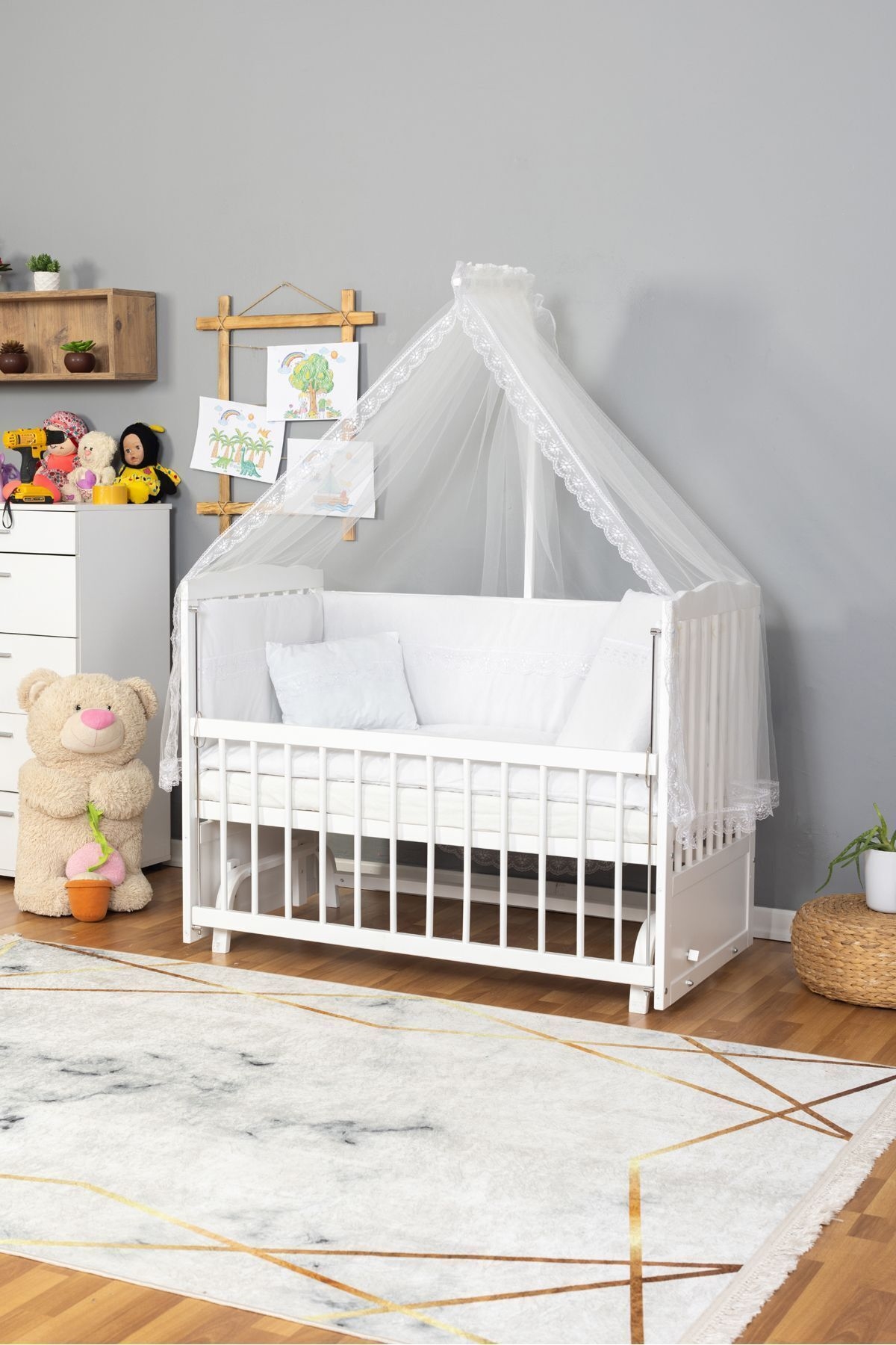 Doğal Ahşap Beşik - Anne Yanı Beşik Beyaz 60x120 - Beyaz Güpür Uyku Seti Yatak