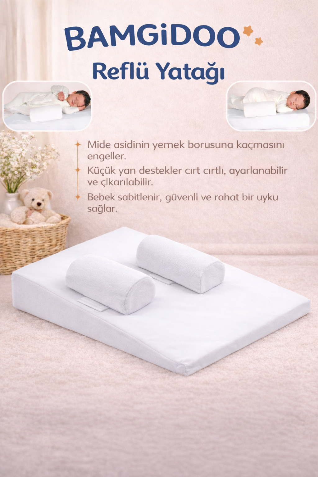 BAMGiDOO Reflü Yatağı, bebeklerde sık görülen reflü problemini azaltmaya yardımcı olmak ve daha güvenli bir uyku pozisyonu sağlamak amacıyla özel olarak tasarlanmıştır. Eğimi sayesinde bebeğin üst gövdesi hafif yukarıda kalır, mide asidinin yemek borusuna kaçmasını önlemeye destek olur.